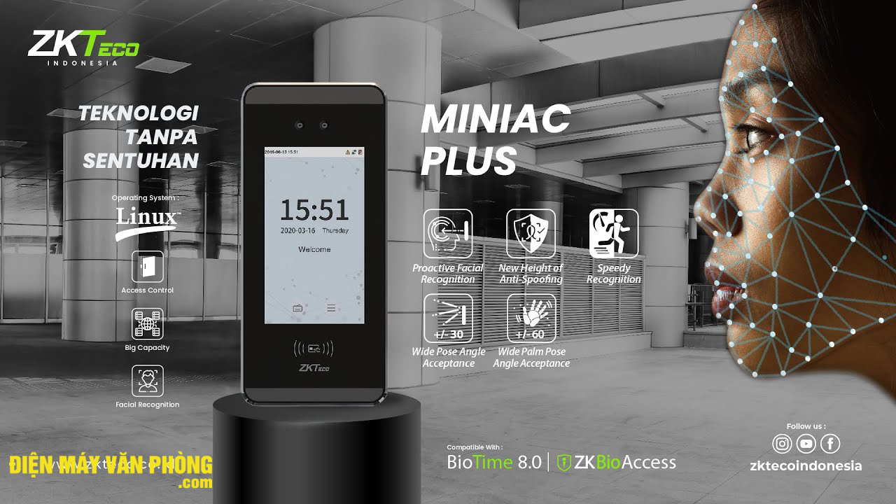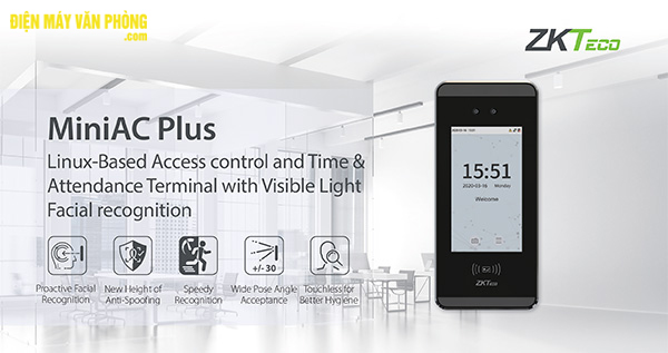 Zkteco MiniAC Plus là một Thiết bị đầu cuối chấm công và kiểm soát truy cập dựa trên Linux với công nghệ Nhận dạng khuôn mặt bằng ánh sáng có thể nhìn thấy cho hiệu suất cao với khả năng chi trả. Thiết bị được thiết kế đặc biệt để cung cấp trải nghiệm người dùng hoàn toàn không chạm để vệ sinh tốt hơn với các chức năng xác minh đa phương thức. Hơn nữa, khoảng cách nhận dạng đã được mở rộng đáng kể với chiều dài lên đến 2 mét, giúp cải thiện đáng kể tốc độ lưu lượng truy cập tối đa.